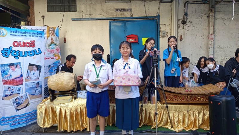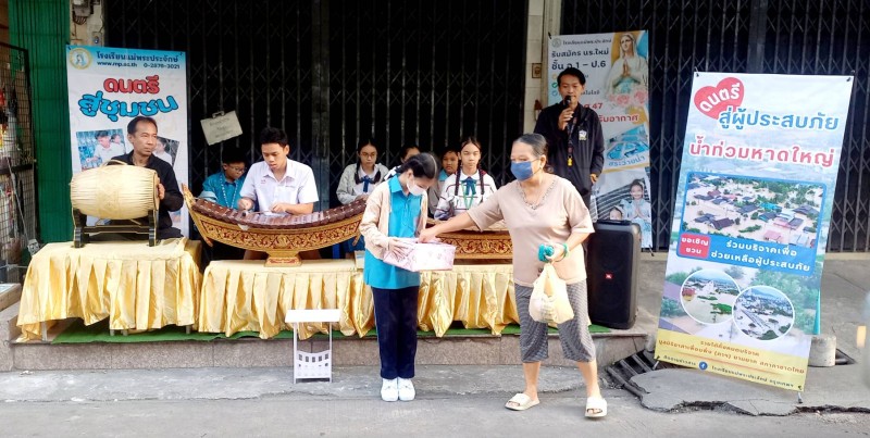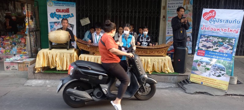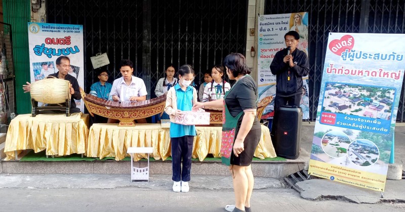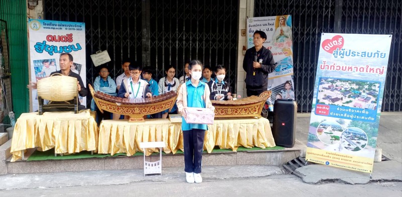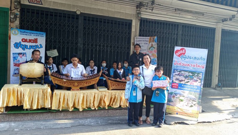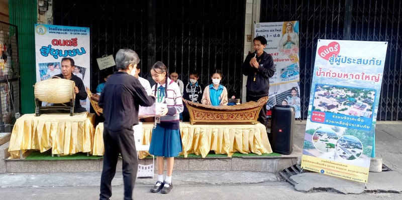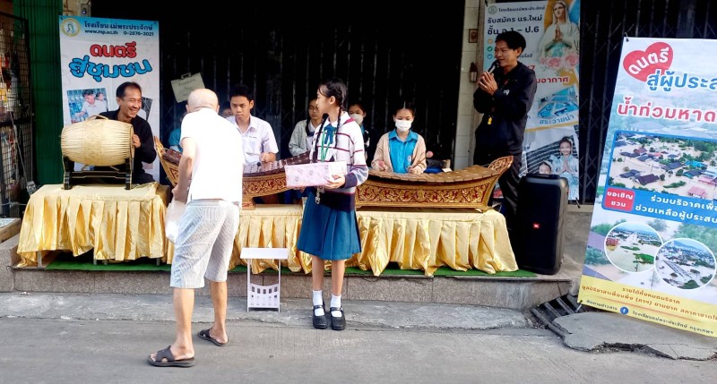 กิจกรรมดนตรีสู่ชุมชนวันนี้ คุณครูมนตรี คุณครูภาณุและเด็กๆชมรมดนตรีไทยโรงเรียนแม่พระประจักษ์ร่วมบรรเลงดนตรีไทย ณ ตลาดซอยอาทิตย์ เพื่อเชิญชวนทุกท่านร่วมบริจาคเงินช่วยเหลือผู้ประสบภัยน้ำท่วม อ.หาดใหญ่ จ.สงขลา