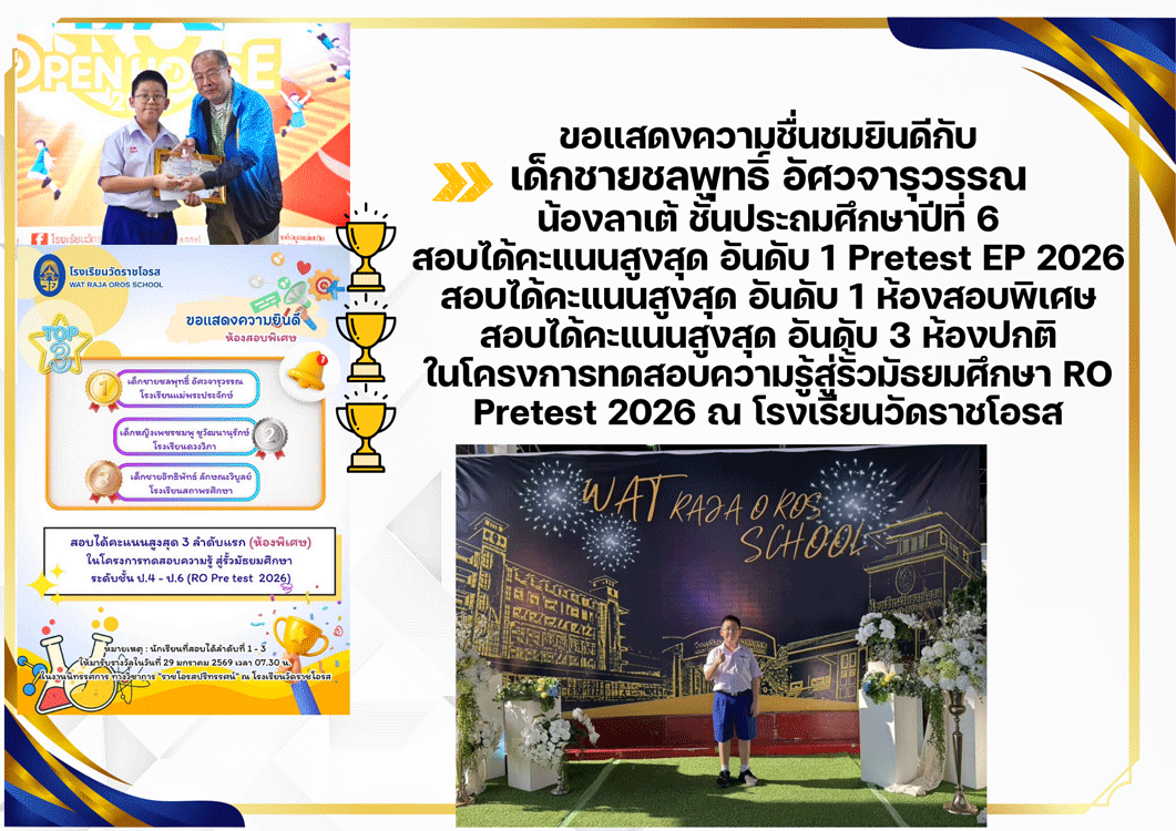 ชื่อผลงาน : สอบได้คะแนนสูงสุด อันดับ 1 Pretest EP 2026 ⭐️สอบได้คะแนนสูงสุด อันดับ 1 ห้องสอบพิเศษ ⭐️สอบได้คะแนนสูงสุด อันดับ 3 ห้องปกติ ?ในโครงการทดสอบความรู้สู่รั้วมัธยมศึกษา RO Pretest 2026 ณ โรงเรียนวัดราชโอรส