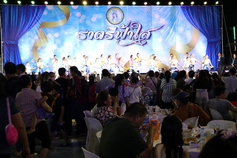 นักเรียนได้แสดงความสามารถบนเวที อันเป็นส่วนหนึ่งในการส่งเสริมทักษะความสามารถ นอกจากนั้นยังเป็นการสร้างบรรยากาศของการมีส่วนร่วมระหว่างครู ผู้ปกครอง นักเรียนและศิษย์เก่าจะได้มีโอกาสพบปะสังสรรค์ และรับประทานอาหารร่วมกัน จึงได้จัดงานราตรีฟ้าใสขึ้น |