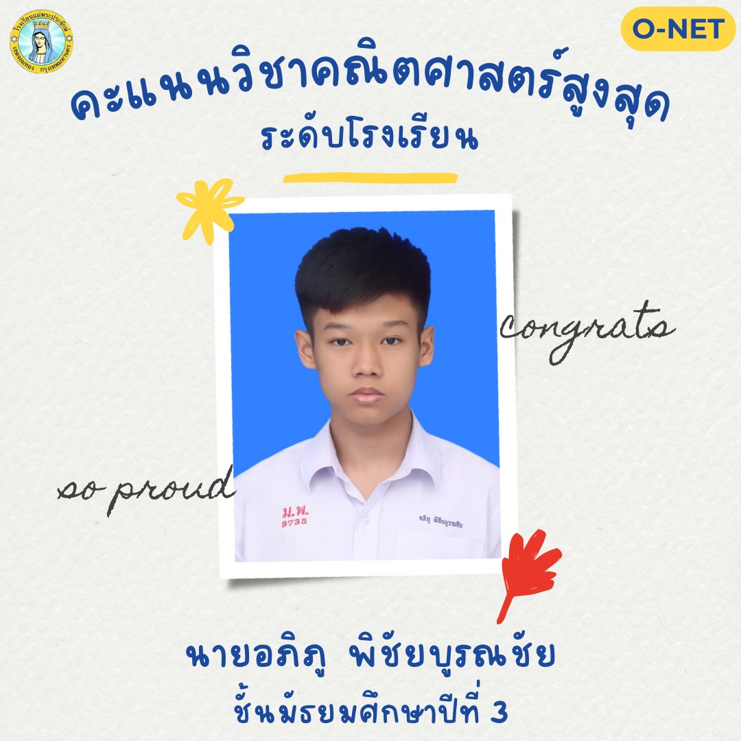ขอแสดงความชื่นชมยินดีกับนักเรียนที่ได้คะแนนสอบโอเน็ตสูงสุดแต่ละรายวิชา ระดับชั้นมัธยมศึกษาปีที่ 3 ปีการศึกษา 2567