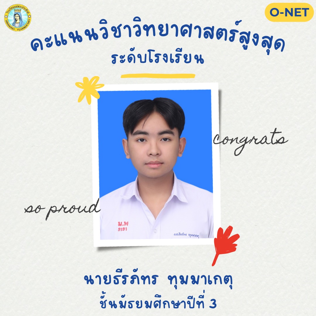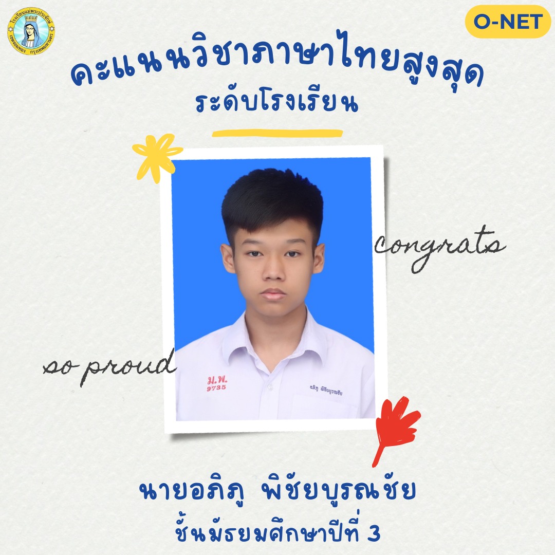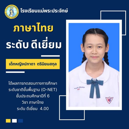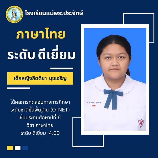 ได้คะแนนวิชาภาษาไทย ระดับ ดีเยี่ยม จากการทดสอบทางการศึกษาระดับชาติขั้นพื้นฐาน O-NET ปีการศึกษา 2567