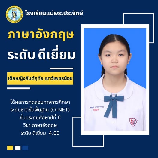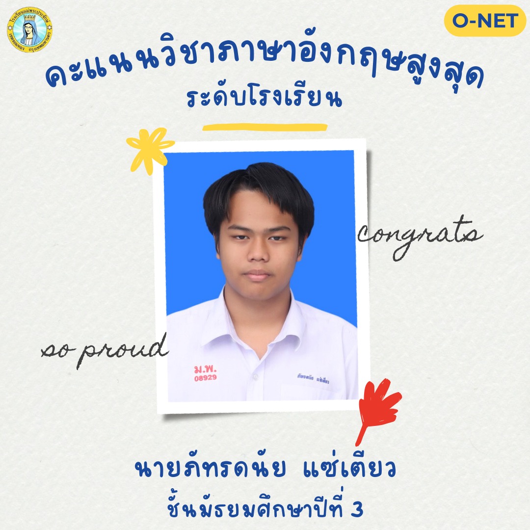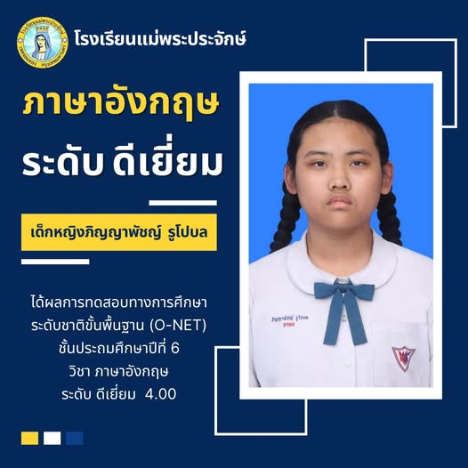 ด้คะแนนวิชาภาษาอังกฤษ ระดับ ดีเยี่ยม จากการทดสอบทางการศึกษาระดับชาติขั้นพื้นฐาน O-NET ปีการศึกษา 2567
